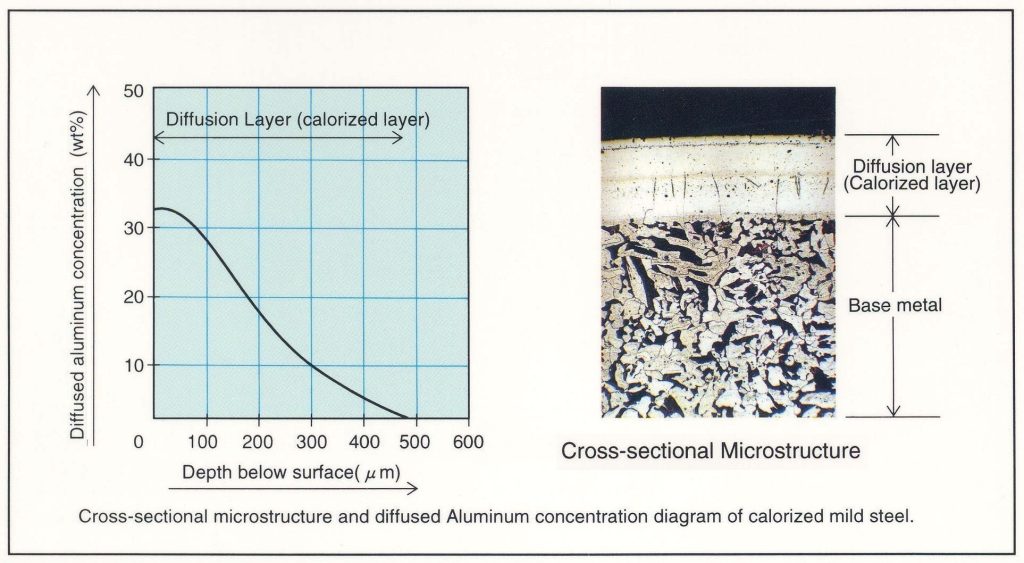 Diagram konsentrasi difusi aluminum dan microstructure potongan penampang lapisan calorizing