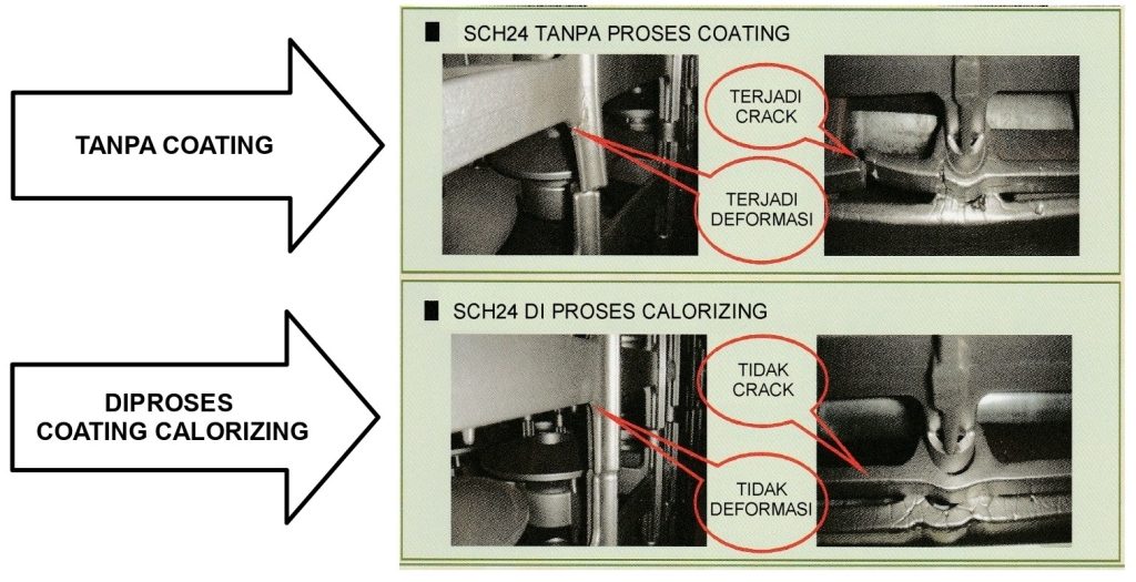 Terlihat Tray yang tanpa coating sudah mengalami retak dan deformasi, sedangkan pada tray yang di proses calorizing masih bagus kondisinya.