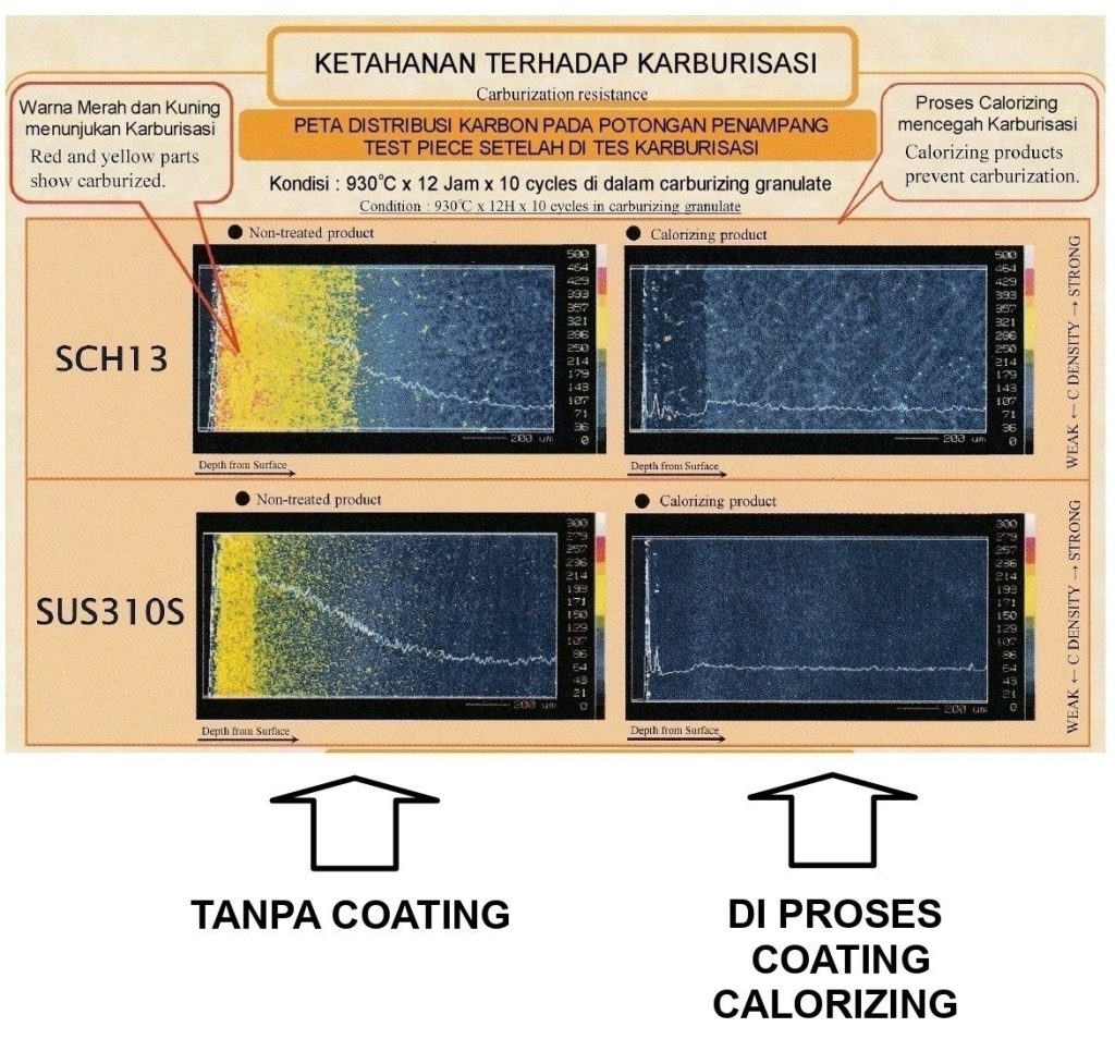 Untuk menjaga agar base tray, tray dan keranjang tidak terdifusi oleh carbon maka dilakukan proses coating Calorizing, lapisan calorizing ini tahan terhadap oksidasi dan karburisasi pada temperature tinggi.
