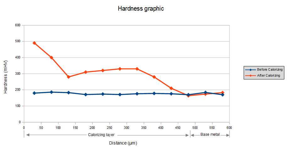 Kekerasan baja normalnya berada di sekitar 140 -180 mHV, sedangkan lapisan Calorizing memiliki kekerasan yang lebih tinggi dari base metal, kekerasan lapisan calorizing sekitar 300 – 500 mHV.