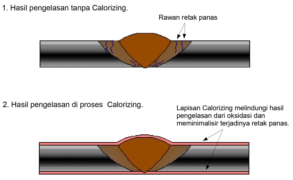 • Lebih baik di las dahulu baru di lakukan proses calorizing karena lapisan calorizing akan melindungi daerah lasan dari oksidasi dan kontaminasi gas yang ada diatmosfir suatu proses.
