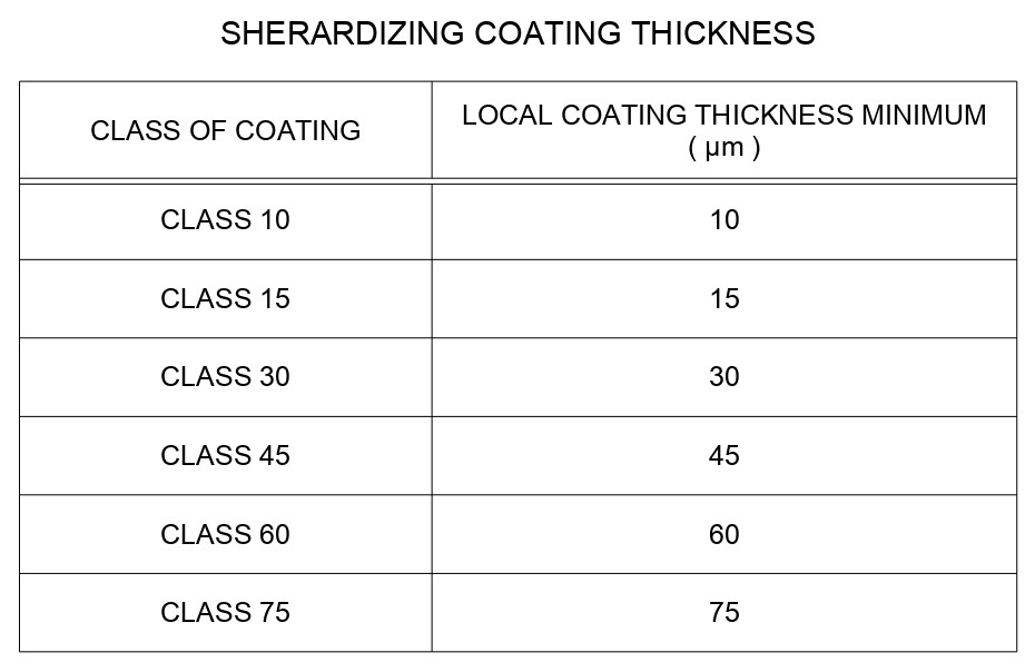 Ketebalan lapisan sherardizing dapat disesuaikan dengan permintaan Customer, secara umum di klasifikasikan kedalam beberapa kelas.