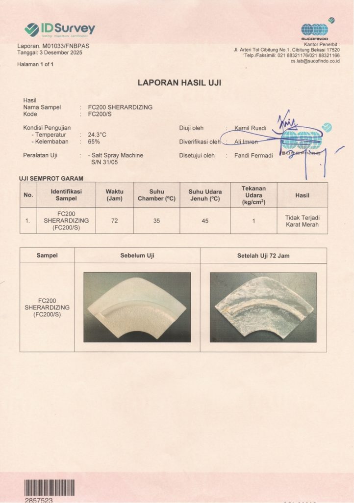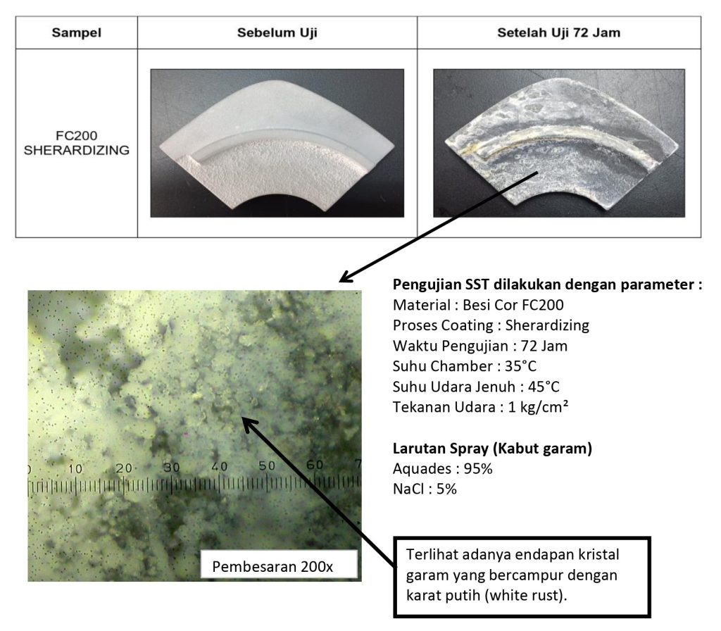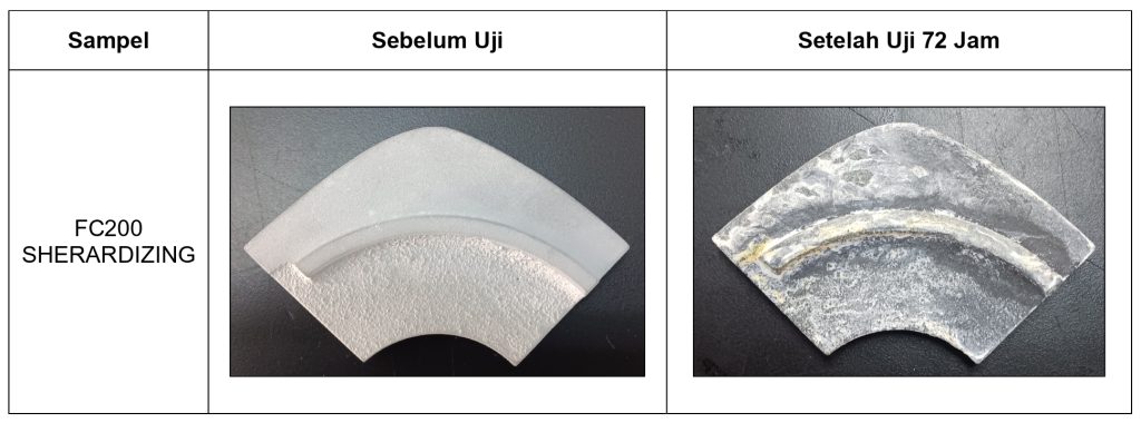 Hasil Pengujian pada sample Besi Cor FC200 yang di coating Sherardizing dengan menggunakan pengujian SST menunjukan tidak terjadi karat merah, hal ini menunjukan bahwa lapisan sherardizing dapat melindungi material FC200 dari terjadinya korosi atau karat.